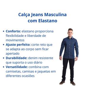 Benefícios - Conforto: elastano proporciona flexibilidade e liberdade de movimentos. - Ajuste perfeito: corte reto que se adapta ao corpo sem ficar apertado. - Durabilidade: denim resistente que suporta o uso diário. - Versatilidade: combina com camisetas, camisas e jaquetas em diferentes ocasiões.