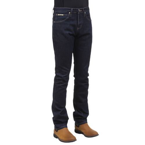 Uma Calça jeans Masculina da marca Ranger's modelo Cowboy Straight, perfeita para os cowboys que precisam de uma calça robusta e ao mesmo tempo confortável para a vida no campo ou para o dia a dia da cidade. Esta fabricada em tecido combinado de Algodão, Poliéster e Elastano de alta qualidade na cor Azul Escuro bastante discreto, possui três bolsos na frente e 2 atrás em modelo tradicional, rebites de metal e botão personalizado.