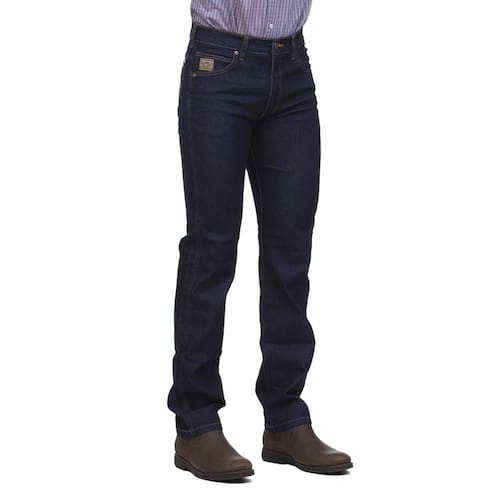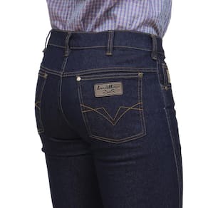 Calça jeans masculina na qualidade Land Horse, fabricada em tecido 74% Algodão 24% Poliéster 2% Elastano na cor Azul Escuro, possui 3 bolsos na frente e 2 atrás em modelo tradicional, rebites de metal e botão personalizado.
