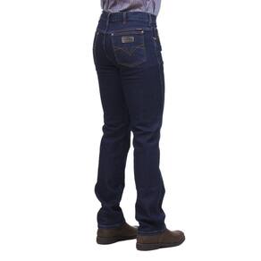 Calça jeans masculina na qualidade Os Vaqueiros, fabricada em tecido 74% Algodão 24% Poliéster e 2% Elastano na cor Azul Escuro, possui 3 bolsos na frente e 2 atrás em modelo tradicional, rebites de metal e botão personalizado.