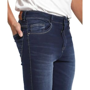 Calça slim fit masculina de lavagem escura com used e bigode á laser. Possui forro de bolso.