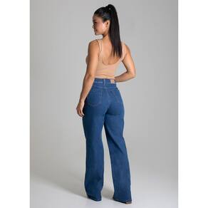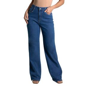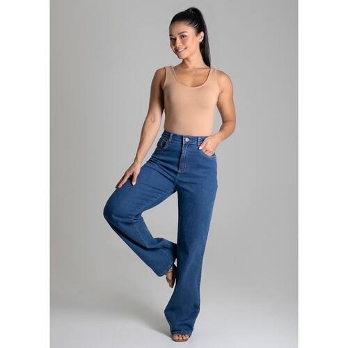 Calça feminina confeccionada em jeans. O modelo pantalona possui cintura alta, gancho no lugar e caimento amplo da coxa até a barra. Cintura alta Bolsos frontais e posteriores funcionais Barra simples Tecido: Jeans Tipo de Lavagem: Azul Cor: Azul médio