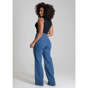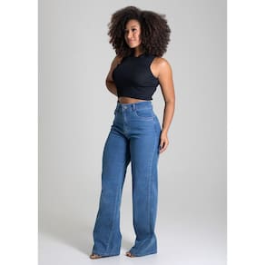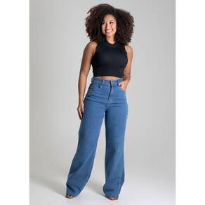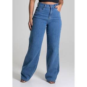 Calça feminina confeccionada em jeans. O modelo pantalona possui cintura alta, gancho no lugar e caimento amplo da coxa até a barra. Cintura alta Bolsos frontais e posteriores funcionais Barra simples Tecido: Jeans Tipo de Lavagem: Azul Cor: Azul médio