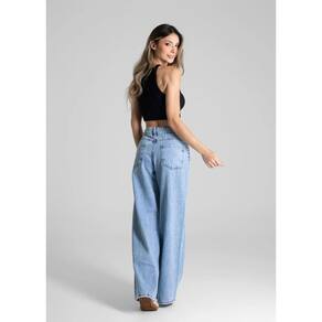 Calça feminina confeccionada em jeans. O modelo possui cintura super alta, gancho no lugar e caimento amplo da coxa até a barra. Cintura alta Fechamento através de um botão e zíper Bolsos frontais e posteriores funcionais Barra simples Tecido: Jeans Tipo de Lavagem: Azul Cor: Azul claro