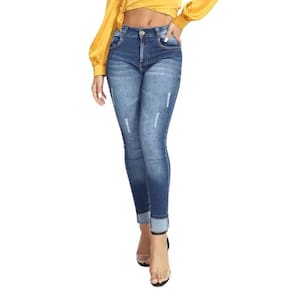Calça skinny longa cintura intermediária, feita em algodão e elastano de lavagem escura, com cós de um botão.