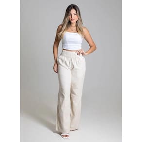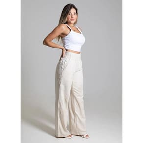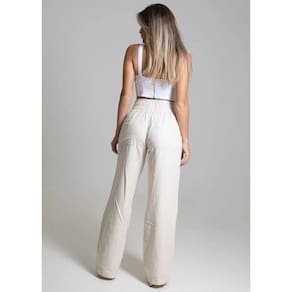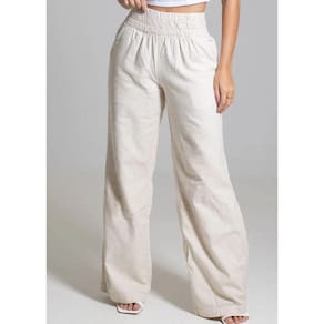 Calça feminina confeccionada em linho. O modelo pantalona possui cintura alta, gancho no lugar e caimento amplo da coxa até a barra.