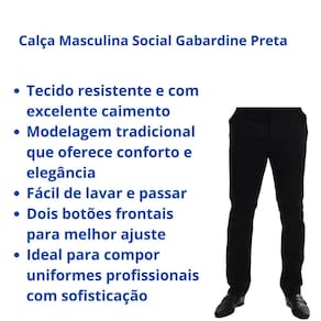 A Calça Masculina Social Preta em tecido Gabardine é ideal para quem busca elegância, conforto e praticidade no dia a dia de trabalho. Com modelagem tradicional, ela se adapta perfeitamente ao corpo e é indicada tanto para uso corporativo quanto para eventos formais.
