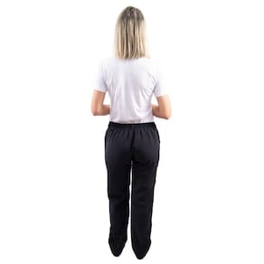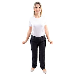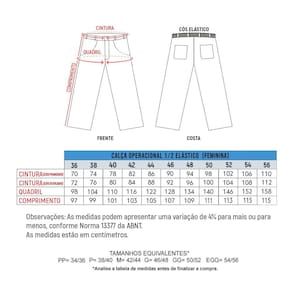 Calça com elástico na metade da cintura (cós meio elástico), permite um maior conforto.