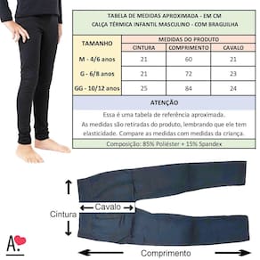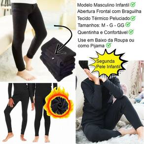 Calça Térmica Infantil Segunda Pele Menino Modelo com Braguilha - 4 a 12 anos. Modelo segunda pele legging (sem pé) masculino infantil, com abertura frontal (Braguilha). Tonalidade preta. Tamanhos disponíveis: M - G - GG - atendendo tamanhos de 4 a 12 anos aproximadamente. Verifique a tabela de medidas disponível nas fotos. Produto com elasticidade. Tecido térmico, possui braguilha (abertura frontal) com fechamento em botão de pressão, barra confortável na cintura e nas pernas, proporcionando acabamento ideal. Produto ideal para manter o corpo aquecido nos dias mais frios. Ideal para utilizar em baixo da roupa, no dia a dia, em viagens e como pijama térmico. Extremamente confortável, e se molda perfeitamente ao corpo, formando uma segunda pele. Possui bastante elasticidade por ser confeccionada em tecido Spandex que é a nova geração de elastano e se molda às formas do corpo, permitindo movimentos de alta performance. Tecnologia anti-odor, proporciona secagem rápida. Composição: 85% Poliester, 15% spandex elastano. Cuidados: Lavar à mão, não utilizar: alvejante, secadora, não lavar a seco, não passar. Atenção: Produto de alta rotatividade. Recebemos novas remessas semanalmente e algum detalhe pode variar de acordo com o lote recebido, porém o produto é o mesmo e mantém as mesmas características e qualidade. Contém: 1 calça modelo legging (sem pé) na tonalidade preta e no tamanho selecionado. Fotos ilustrativas e reais do produto.