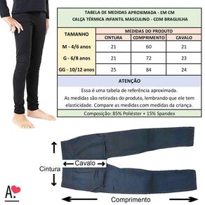 Calça Térmica Infantil Segunda Pele Menino Modelo com Braguilha - 4 a 12 anos. Modelo segunda pele legging (sem pé) masculino infantil, com abertura frontal (Braguilha). Tonalidade preta. Tamanhos disponíveis: M - G - GG - atendendo tamanhos de 4 a 12 anos aproximadamente. Verifique a tabela de medidas disponível nas fotos. Produto com elasticidade. Tecido térmico, possui braguilha (abertura frontal) com fechamento em botão de pressão, barra confortável na cintura e nas pernas, proporcionando acabamento ideal. Produto ideal para manter o corpo aquecido nos dias mais frios. Ideal para utilizar em baixo da roupa, no dia a dia, em viagens e como pijama térmico. Extremamente confortável, e se molda perfeitamente ao corpo, formando uma segunda pele. Possui bastante elasticidade por ser confeccionada em tecido Spandex que é a nova geração de elastano e se molda às formas do corpo, permitindo movimentos de alta performance. Tecnologia anti-odor, proporciona secagem rápida. Composição: 85% Poliester, 15% spandex elastano. Cuidados: Lavar à mão, não utilizar: alvejante, secadora, não lavar a seco, não passar. Atenção: Produto de alta rotatividade. Recebemos novas remessas semanalmente e algum detalhe pode variar de acordo com o lote recebido, porém o produto é o mesmo e mantém as mesmas características e qualidade. Contém: 1 calça modelo legging (sem pé) na tonalidade preta e no tamanho selecionado. Fotos ilustrativas e reais do produto.
