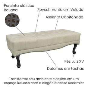 A Calçadeira recamier Vicenza nos traz o estilo neoclássico o deslumbre imperial do conforto e beleza transforma seu ambiente clássico em um espaço luxuoso com total elegância, e HR de alta resiliência tem como principal característica, o alto retorno ao seu estado inicial, oque garante mais conforto e maior durabilidade nos produtos trazendo para o ambiente requinte e luxo. Produzida com madeira 100% de reflorestamento. Acompanha Almofadas extras: Não Altura dos Pés: 24 Complexidade da Montagem: Baixa: pode ser montado por uma pessoa sozinha Cor: Bege Cor do Produto: Bege Enchimento do Assento: Espuma D-26 Estampado: Não Estofado: Sim Informações Complementares: A recamier Vicenza nos traz o estilo neoclássico o deslumbre imperial do conforto e beleza transforma seu ambiente clássico em um espaço luxuoso com total elegância, e HR de alta resiliência tem como principal característica, o alto retorno ao seu estado Itens Inclusos: Recamier Vicenza Linha ou Coleção: Vicenza Manual de Montagem e Instalação: https://product-hub-prd.madeiramadeira.com.br/839282/documents/097e26cd-38fd-45be-baed-175ec1534a8347449manualrecamiervicenza.pdf Material da Estrutura: Madeira Eucalipto Material dos Pés: madeira maciça LUIS XV Necessita Montagem: Sim Origem do Produto: Nacional Peso: 17.3 Possui Baú: Não Possui Gavetas: Não Possui Percintas Elásticas: Sim Possui Pés: 04 Possui Portas: Não Possui Revestimento Interno: Não Possui Rodízio: Não Recomendações de Uso, Manutenção e Limpeza: Limpeza: Utilize pano levemente úmido Sistema de Montagem: É necessário apenas fixar os pés. Suporta Até (kg): 150 Ean: 7908308780774