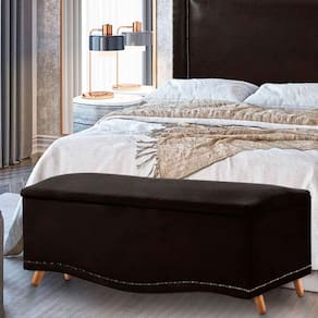 CARACTERISTICAS DO PRODUTO: Material da Estrutura: Madeira de eucalipto Material e Densidade da Espuma: Poliuretano sem carga Revestimento: Sintetico Facto Tipo de Pe: Em madeira chanfrado de 10,5 cm Possui Frame: Nao Pistoes no Bau: Sim