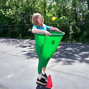 - Calce estas calças malucas para um toque desenfreado no arremesso do anel. Ideal para quebrar o gelo em churrascos, aniversários ou aulas de educação física, este jogo de calças de avó garante risos e energia