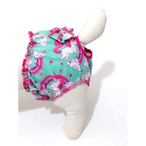 Calcinha em tecido tricoline ou textoleen, com elástico; Cor: estampa unicórnio verde; Acabamento em viés rosa; Laço na cor do tecido ; Tamanho: M Medidas aproximadas: 36 cm de cintura, 15 cm de comprimento; Ideal para cachorrinha no cio, pois oferece mais proteção e se ajusta ao corpinho; Possui elástico para facilitar o uso e trazendo conforto; Seu tecido de alta qualidade com um estampa fofinha para deixala ainda mais charmosa. Marca: Não Informado