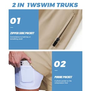 - ?Bolsos com zíper?Design de shorts de natação masculinos com 3 bolsos, os dois bolsos externos têm zíper para evitar que os itens caiam durante o exercício, e os bolsos internos são ajustados e elásticos para facilitar a colocação de telefones celulares, chaves e outros pertences. Estes bolsos são ótimos para manter seus itens pessoais seguros quando você estiver correndo!