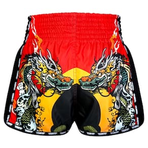 Shorts TUFF Muay Thai: Os shorts de corte clássico são inspirados na era dourada do Muay Thai nos anos 80. A cintura baixa e o corte curto com fendas nas pernas nas aberturas dos dois lados para maximizar a amplitude de movimento.