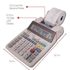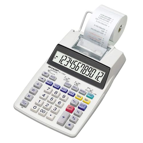 Calculadora de impressão Sharp SH-EL1750V, preto/vermelho - tela angular de 12 dígitos, cálculo do custo/venda/margem, cálculo do imposto +/- - embalagem da caixa colorida cinza, adaptador de alimentação opcional não incluído - 230 x 150 x 52 mm 500 g - Adaptador de alimentação opcional e rolos de papel não incluídos