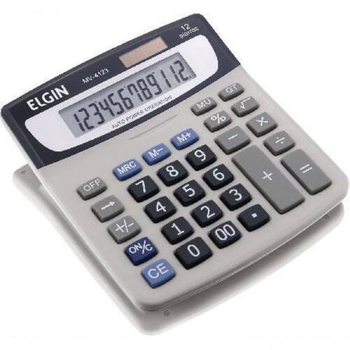 Calculadora De Mesa Mv-4123 Calculadora de mesa 12 dãgitos; Possui visor LCD; Possui memãria, cãlculo de porcentagem e inversão de sinais, correãão total e desligamento automãtico; Funãão GT, funãão MU e correãão parcial; Funciona a bateria (G10) e energia solar. NA Ean: 7897013517402