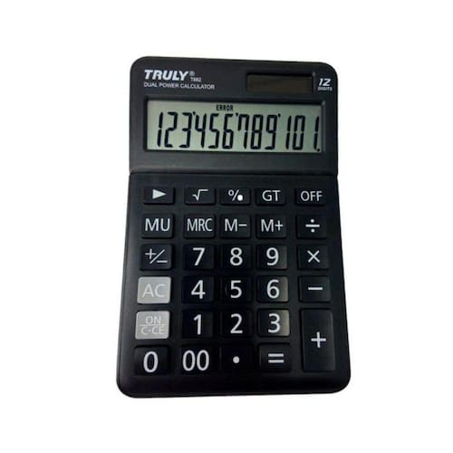 Calculadora De Mesa Truly 12 Digitos - T882 Marca: TRULY; Modelo: T882; Linha: Calculadora de mesa; Cor: Preta; Contém: 1 unidade do produto; Medidas: 112 x 172 x 33mm; Visor Extra Grande de 12 dígitos; Visor inclinável; Tecia Roll-Over; Desligamento automático; Silenciosa, não faz barulho ao teclar; Possui manual de instruções com algumas fórmulas de cálculo.