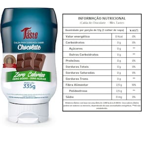 Ingredientes - Sabor Chocolate: Água, polidextrose, cacau em pó, cloreto de potássio, espessantes goma xantana e carboximetilcelulose, conservadores sorbato de potássio e benzoato de sódio, aroma natural, corante natural caramelo e edulcorantes sucralose e acessulfame de potássio. NÃO CONTÉM GLÚTEN.