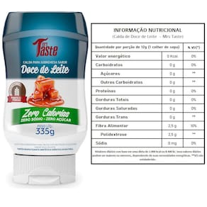Ingredientes - Sabor Doce de Leite: Água, polidextrose, cloreto de potássio, espessantes goma xantana e carboximetilcelulose, aromatizante, conservadores sorbato de potássio e benzoato de sódio, edulcorantes sucralose e acessulfame de potássio e corante natural caramelo. NÃO CONTÉM GLÚTEN.