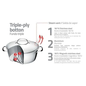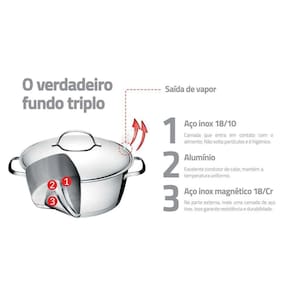 Economiza tempo e energia: o segredo está no fundo triplo (aço inox + alumínio + aço inox), que distribui o calor uniformemente, proporcionando um cozimento mais rápido. Por isso, você pode manter o fogo baixo durante todo o preparo e, assim, poupar energia. Além disso, o caldeirão toda em aço inox pode ir ao forno para gratinar ou finalizar pratos, na temperatura máxima de 260C.