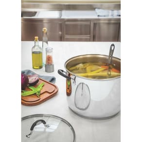 Fabricado em aço inox, o caldeirão oferece durabilidade e resistência, além de não liberar resíduos nas suas receitas, tornando-as mais saudáveis. Sua tampa em vidro permite visualizar o cozimento dos alimentos, enquanto as alças e pegadores revestidos em silicone antitérmico proporcionam mais segurança e conforto no manuseio.