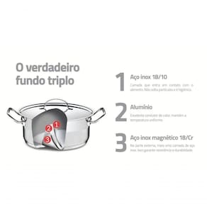 - Totalmente feita em aço inox, por isso não solta nenhum resíduo nos alimentos, mantendo-os saudáveis. - Altamente durável, mantém as características , preservando a beleza, a higiene e a durabilidade do material. - O fundo triplo (aço inox + alumínio + aço inox) distribui o calor uniformemente, proporcionando um cozimento mais rápido e uniforme, economizando energia e deixando os alimentos aquecidos por mais tempo. - Alças fixados por solda-ponto, com maior reforço. - Alças longas e tubulares em aço inox para manuseio .- Acabamento com faixa satinada e alto brilho.- Pode ser lavado diariamente Na máquina de lavar louças.- Pode ser utilizada nos fogões: elétrico, gás, indução e vitrocerâmico.