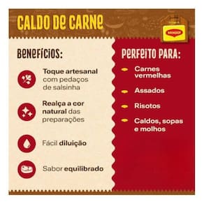 Caldo de Carne possui sabor intenso, e garante mais rendimento e mais sabor para suas receitas. Pode ser utilizado para temperar ou como base para sopas e caldos.
