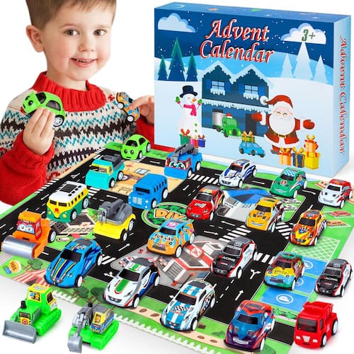 24 Pull-Back Cars & Play Mat: inclui uma variedade de veículos (corrida, engenharia, bombeiros, policiais, carros urbanos) e um tapete de brincar para diversão criativa. Desfrute de uma nova surpresa a cada dia que antecede o Natal.