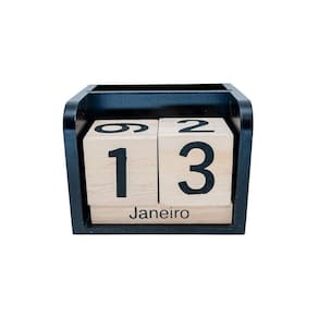 - madeira; - dia e mês; - 1 base; - 2 cubos para a data; - 3 retângulos para o mês; - tamanho aproximado de 9cmx13cmx10cm; - espaço para canetas não inclusas ;