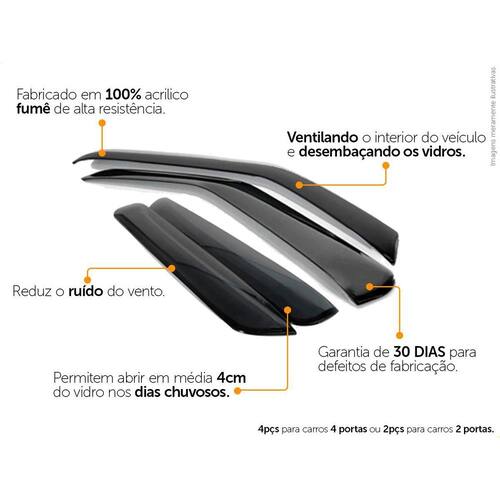 Especificação Técnica: - 100% Acrílico - Modelo específico do veículo - Tamanho padrão de fábrica - Cor Fumê - Reduz ruídos do vento - Permite abrir em média 4cm do vidro em dias chuvosos - Possui sistema de fixação por fita 3M - Acompanha 1 Primer para limpeza