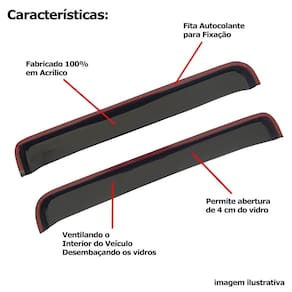 itens inclusos: - uma 1 calha de chuva para a porta dianteira esquerda motorista . - uma 1 calha de chuva para a porta dianteira direita passageiro . - uma 1 calha de chuva para a porta traseira esquerda atrás do motorista . - uma 1 calha de chuva para a porta traseira direita atrás do passageiro . Dimensões - comprimento: 95 cm dianteiro / 60 cm traseiro - largura: 8 cm todos - altura: 1 cm todos