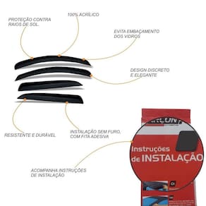 Com design flat e sistema de fixação que não agride a pintura do carro, as calhas Marçon foram projetadas para proporcionar um design inovador ao seu veículo. Em dias de chuva, permitem que o motorista e passageiros mantenham a janela com determinado espaço aberto sem infiltração de água, o que ajuda a não embaçar os vidros e mantem a circulação de ar dentro do veículo, garantindo conforto. São uma ótima opção para os veículos que não possuem ar-condicionado. Fabricada em acrílico de alta qualidade e durabilidade, as calhas possuem proteção contra raios UV e diversas condições climáticas. Além disso, a instalação é simples e rápida pois é feita através de fitas dupla face que acompanham o produto.