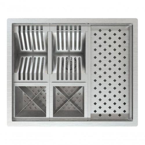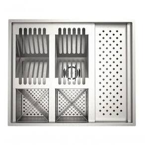 Módulo maior contém: 02 módulos para pratos (total para 12 pratos), 01 grande módulo para copos, 02 módulo com 08 recipientes para talheres e utensílios. (essas partes são removíveis, podendo dividir em apenas 2 partes ou serem retirados para o módulo ficar livre) servindo para talheres, bucha e detergente ou até mesmo vaso de flores.