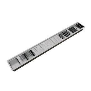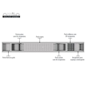 O modelo Kitchen 6 módulos com porta horta contém: 02 módulos para pratos (total para 12 pratos), 01 módulo para copos, 01 módulo com 09 recipientes para talheres e utensílios, 01 módulo porta esponja com detergente e 01 módulo porta horta ou gelo. Tradicionalmente conhecido como escorredor de louças, a calha úmida vai completar sua cozinha e espaço gourmet. A linha Kitchen 6 módulos traz praticidade e sofisticação para seu projeto, podendo ser instalada no granito, corian, madeira entre outros materiais. Instalação sobreposta ou embutida sob o tampo. A calha irá coletar toda água dos escorredores e escoará diretamente pelo esgoto através de um dreno (acompanha o produto) no centro da peça o qual poderá ser ligado no sifão da cuba ou em um ponto exclusivo de esgoto para calha.