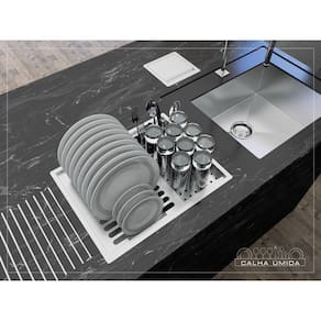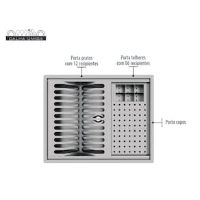 O modelo Quadratta com tampa contém: 01 módulo para pratos (total para 12 pratos), 01 módulo para copos, 01 módulo com 06 recipientes para talheres e utensílios e a exclusiva tampa removível. Tradicionalmente conhecido como escorredor de louças, a calha úmida vai completar sua cozinha e espaço gourmet. A linha Quadratta com tampa removível traz praticidade e sofisticação para seu projeto, podendo ser instalada no granito, corian, madeira entre outros materiais. A exclusiva tampa Calha Úmida permite total aproveitamento da bancada, deixando o espaço mais organizado, moderno e prático para o dia a dia.