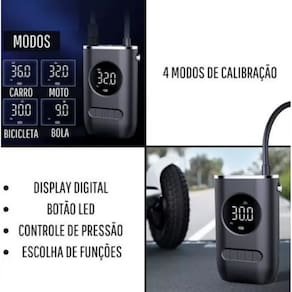 Enche: Pneus de carros, motos, bicicleta, bolas e infláveis. Produto compacto e potente, indispensável para ter em casa ou no carro. O Compressor é portátil e recarregável, conta com uma bateria de 2000 mAh com diversos modos predefinido. Para carro, moto, bicicleta e bolas. O melhor custo benéfico do mercado.