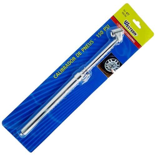 Descrição do Produto:. - Marca: Western, - Calibrador de 1-8.6kgs/cm, - A cabeça do calibrador alcança a válvula do pneu em todas as posições, - Com clip Tipo Aro , - 150 PSI, - Comprimento: 28 cm, - Altura: 1,9cm, - Diâmetro: 1 cm. - Composição: Metal, plastico e Borracha Ean: 7897186016542