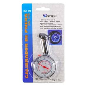 Calibrador De Pneus Com Relógio Western - Corpo durável. - Mantém a leitura com precisão. - Ângulo de posicionamento para fácil utilização. - Ideal para, carros, motos, bicicletas e infláveis. - Informações: Calibrado em Ibs, Kgs, Kpa; Para a leitura é necessário segurar pressionando-se o botão; Para economizar gasolina e manter a forma do pneu com calibração apropriada;