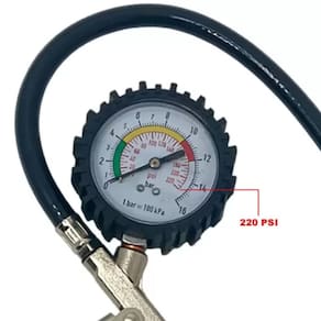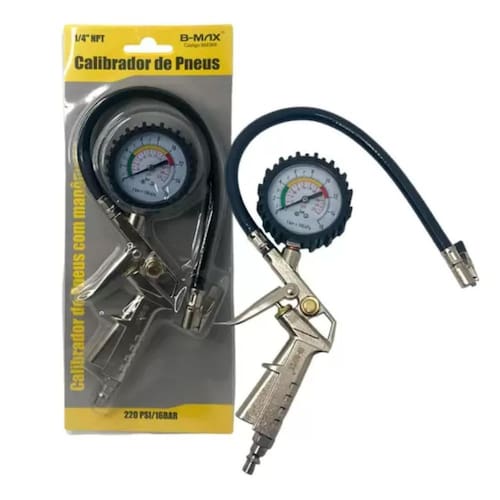 Calibrador Manual é Indicado para inflar, esvaziar e medir a pressão dos pneus, pode ser em Automóveis leves, motos, bicicletas e até mesmo em pneus menores como carrinho De mão que possuam câmara de ar, conta com manômetro e encaixe de rosca de 1 / 4 NPT, possui estrutura em alumínio que proporciona uma maior resistência À oxidação e corrosão, seu bico é flexível e oferece mais praticidade na Aplicação. Informações Técnicas: Calibrador e Inflador com Manômetro Mangueira Flexível Bico com Presilha Fácil Operação Fabricado em Liga de Alta Qualidade Produz Agilidade na Hora do Trabalho Encaixe de Rosca de 1 / 4 NPT Manômetro Para Monitoramento Pressão de Trabalho 220 PSI/16BAR Itens Inclusos: 1x Calibrador Manual de Pneus Marca: Não Informado Ean: 7893095441918