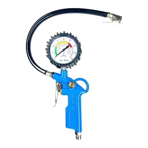 Características Principais: Tipo: 3 em 1 Calibragem, Esvaziamento e Aferição Material da Caixa: Alumínio. Mangueira: 36 cm de comprimento Peso: 345 Gramas Pressão Máxima: Suporta até 220 PSI Escala: BAR/PSI Entrada: Conector 1/4 NPT macho Marca: Steels.