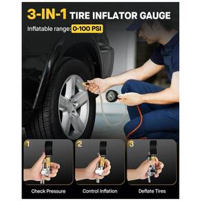 Esta ferramenta essencial de carro portátil 3 em 1 oferece um calibrador de pressão de pneus com inflador, permitindo a desinflação, inflação e verificação da pressão dos pneus. Compatível com todas as saídas de compressores de ar NPT, incluindo Conexão Rápida NPT, sendo um ótimo presente para homens. O calibrador de pressão de pneus com inflador mede com precisão de 0100 PSI, atendendo aos padrões ANSI B40.1. Possui mangueira trançada resistente a vazamentos e um conector giratório de latão sólido. Seu mostrador luminoso facilita a leitura mesmo no escuro. Pode ser utilizado em diversos veículos, como caminhões, SUVs, carros e motocicletas, aumentando a segurança na condução. A calibragem adequada dos pneus reduz o risco de falhas causadas por pressão incorreta, além de diminuir o consumo de combustível, custos de manutenção e despesas com reparos, aumentando a vida útil dos pneus. Acompanha diversos acessórios, como bico de ar, adaptador de válvula Presta e manual de instruções.