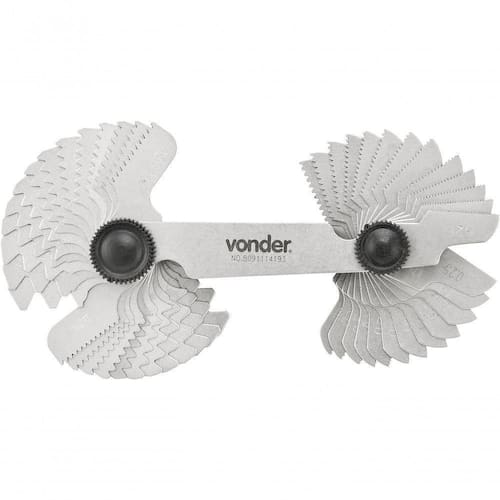1 Cálibre/pente de rosca, composto por 52 lâminas, sendo: 24 lâminas rosca métrica 60 com passo de 0,25 mm até 6,0 mm e 28 lâminas rosca polegada 55 de 62 até 4 fios por polegada