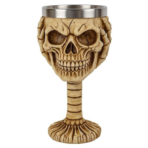 Material Externo: Resina de Alta Qualidade Interior: Aço Inoxidável Capacidade: 180 ml Altura Total: 19 cm Diâmetro Superior: 7 cm Peso Aproximado: 470g Cor: Osso envelhecido com tons escurecidos Estilo: Medieval / Gótico / Decorativo
