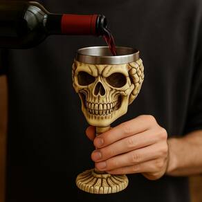 Transforme qualquer ocasião em uma experiência única com esta incrível Taça Medieval em formato de Caveira Feita em resina de alta resistência, esta peça é esculpida com riqueza de detalhes que imitam ossos envelhecidos, criando um visual marcante e sombrio. O design apresenta uma caveira tridimensional com expressão realista e rachaduras propositais, apoiada por uma base em forma de coluna vertebral e pés ósseos. Um verdadeiro destaque para fãs do estilo gótico, medieval ou colecionadores de peças temáticas. O interior conta com um revestimento em aço inoxidável, ideal para o consumo de bebidas com segurança e higiene. A camada interna mantém a temperatura do líquido por mais tempo, além de facilitar a limpeza após o uso.
