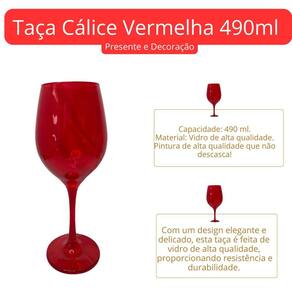 Cálice Vidro Altar Vermelho 490ml Cálice Vidro Altar Vermelho 490ml Capacidade: 490ml Ideal para Vinho, Água e Outras Bebidas Transforme seus momentos de confraternização com a Taça de Vidro Vermelha da Nadir. Com um design elegante e moderno, essas taças são perfeitas para servir seus vinhos, água e outras bebidas favoritas com estilo e sofisticação. Características:
