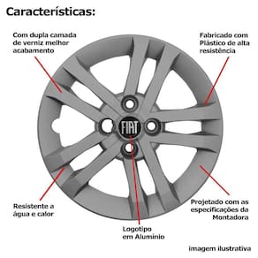 Cada pacote inclui uma calota para roda aro 14 com emblema em alumínio. As dimensões da calota são: diâmetro de 39 cm e altura de 4 cm.