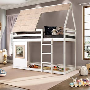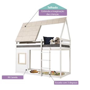 Projeto - A cama é cercada por toda as laterais com barras, garantindo noites mais seguras. A escada com 3 degraus na parte frontal. O painel com janelinha e o telhado casinha, deixam a cama mais divertida e lúdica. Devido sua estrutura alta, a parte de baixo da cama, pode ser mais um ambiente a ser explorado, seja com almofadas para brincar, um esconderijo ou até mesmo um espaço para as tarefas da escola. Um móvel incrível para fazer do quarto o local mais divertido da casa.
