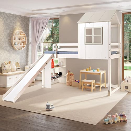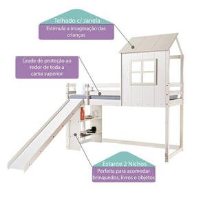 A cama é cercada por toda as laterais com barras, garantindo noites mais seguras. A escada com 3 degraus na parte lateral. O painel com janelinha, o telhado casinha e o escorregador, deixam a cama mais divertida e lúdica. A estante montessoriana é perfeita para colocar objetos e brinquedos. Devido sua estrutura alta, a parte de baixo da cama, pode ser mais um ambiente a ser explorado, seja com almofadas para brincar, um esconderijo ou até mesmo um espaço para as tarefas da escola. Um móvel incrível para fazer do quarto o local mais divertido da casa.